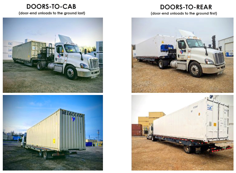 The positioning of the container doors on the delivery truck is something to keep in mind when setting up your delivery. Our delivery trucks back into the spot where the container will go, slide the container back, and pull out from under it.